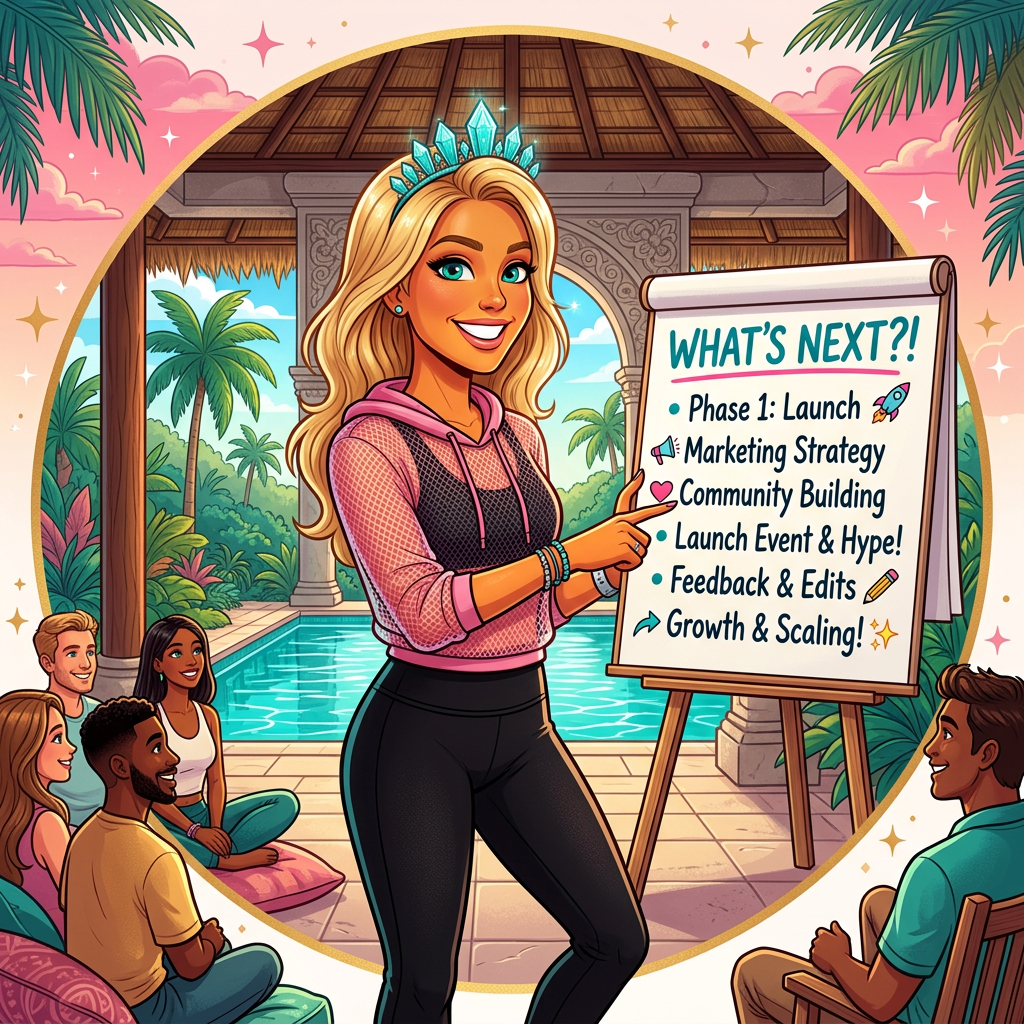 Standing at the flip chart in a tropical villa, palm trees and pool through the archway behind her. Accountability, Community, Habit Tracker, Fitness, Bombshell Bootcamp — she wrote the damn list.