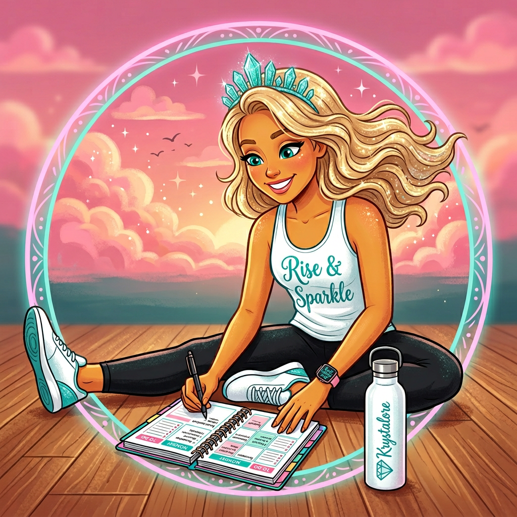 Cross-legged on the yoga mat, Crews Beyond Limits tank, planner open with reflection pages and goal tracking. Smartwatch counting the minutes, sneakers still on. She plans her empire from the floor up.