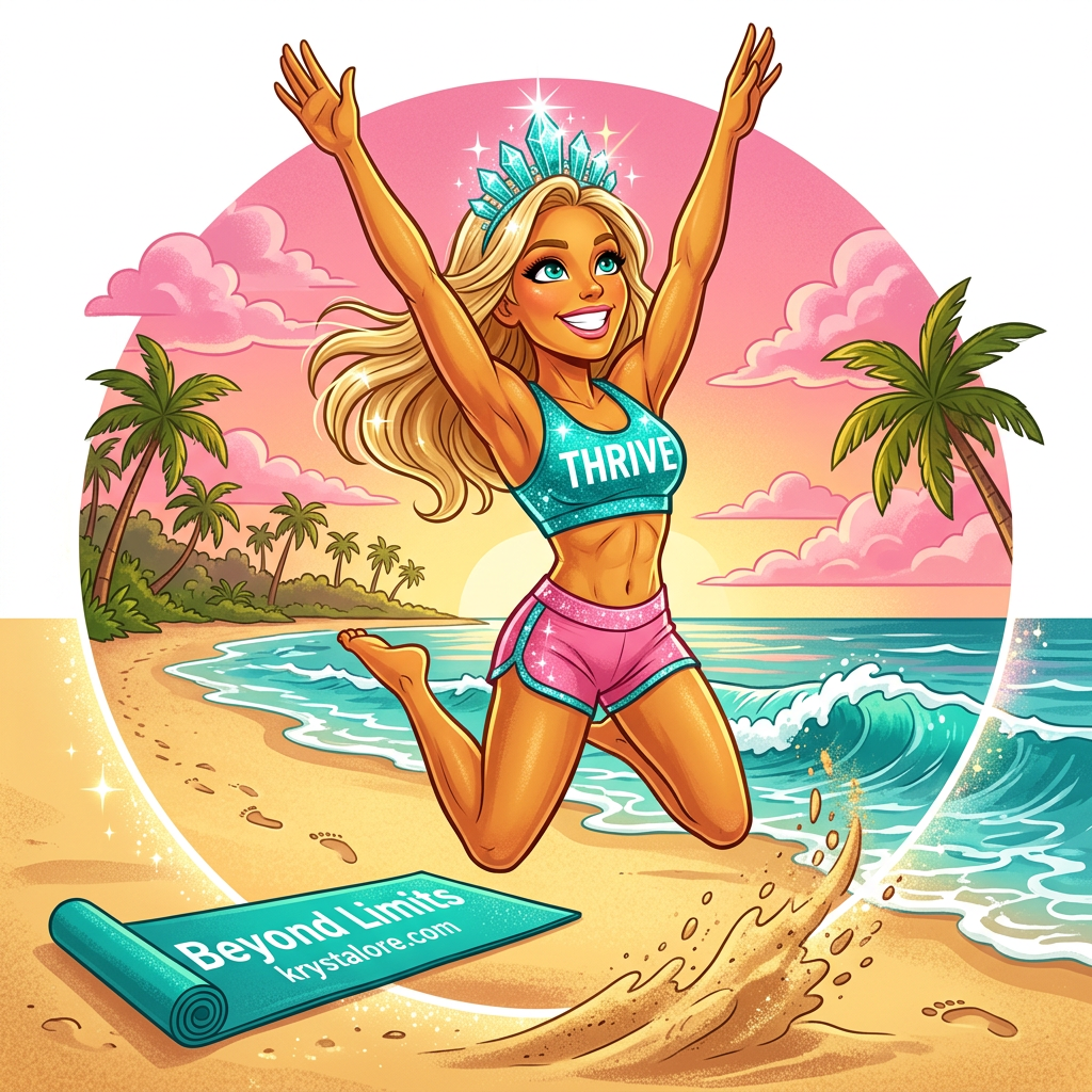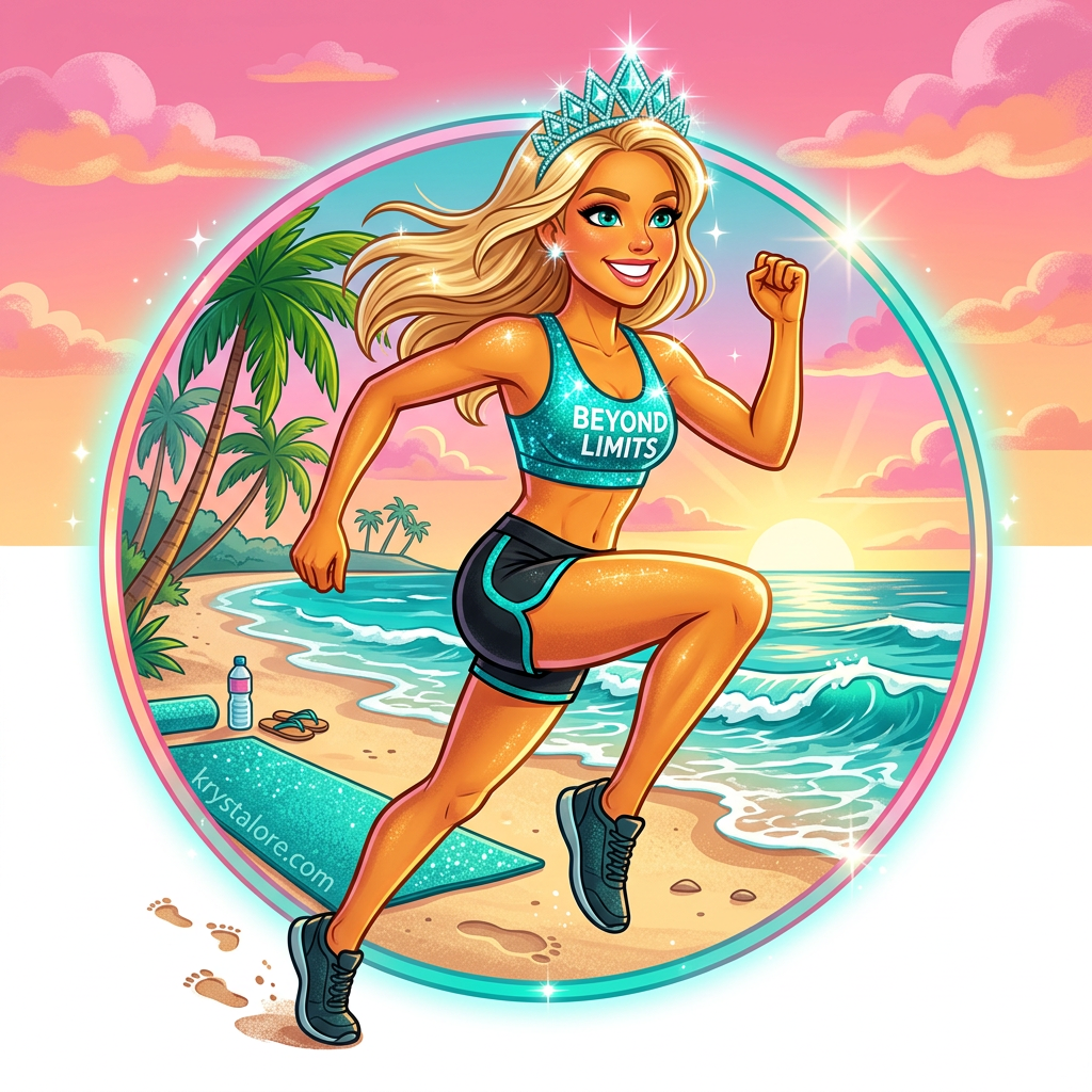 High knees on the sand, "Beyond Limits" across her chest, palm trees swaying, yoga mat branded and ready. She doesn't jog — she attacks.