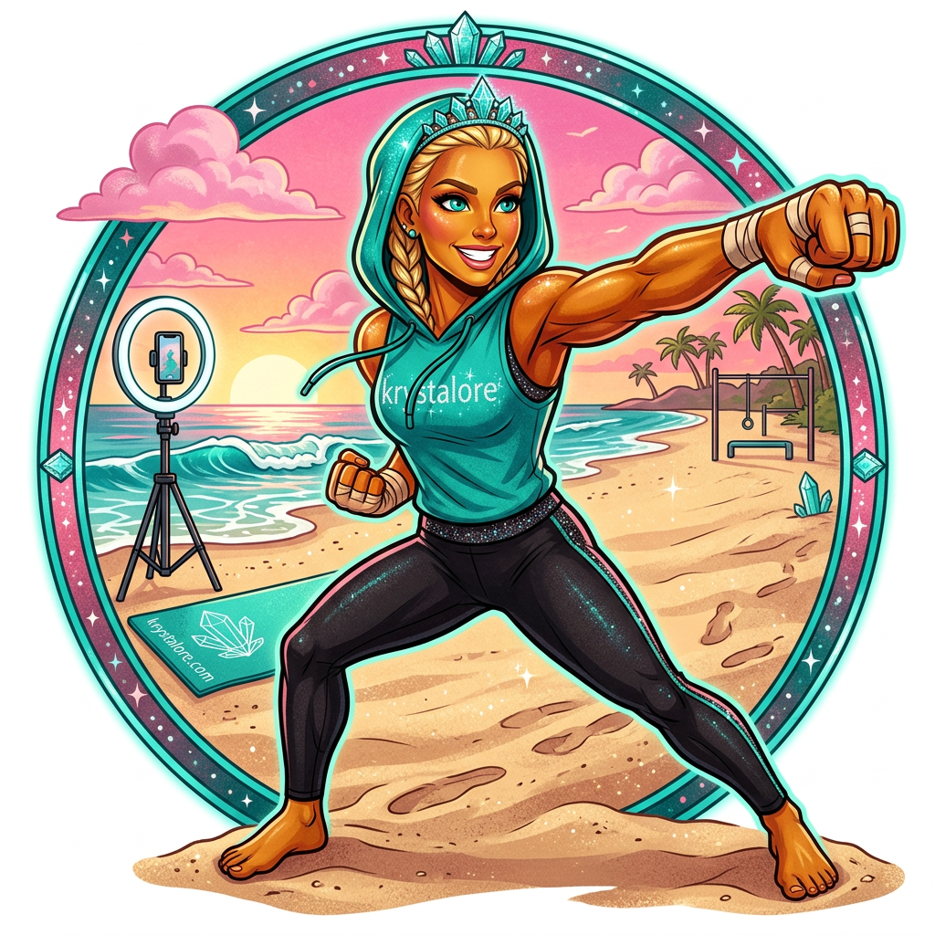 Sleeveless teal hoodie, hood up, strings hanging, bronze arms on full display. Karate stance on the sand with ring light rolling. She films her own legend.