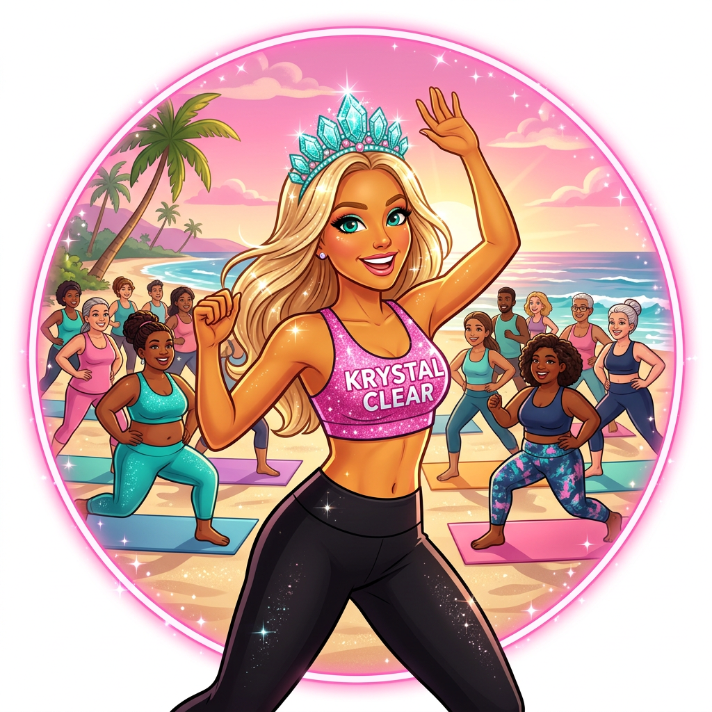 Leading a class of every shape and size on the beach. "Krystal Clear" on her chest, smiles all around. Transformation doesn't have a dress code.