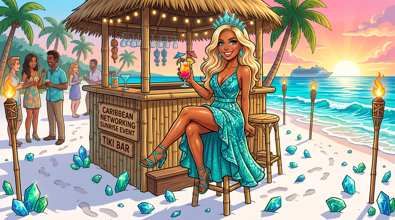 Tiki bar, cocktail umbrella, cruise ship on the horizon, teal crystals scattered in the sand. She networks where others vacation. Business never looked this good.