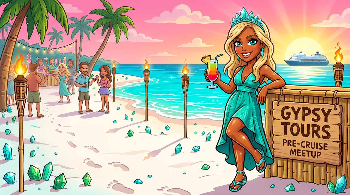 Teal island dress, sparkly shoes, leaning on the Gypsy Tours tiki bar with a rum punch in hand. Teal crystals on the sand, tiki torches blazing, cruise ship on the horizon, sunrise painting the sky. The ultimate pre-cruise networking queen.